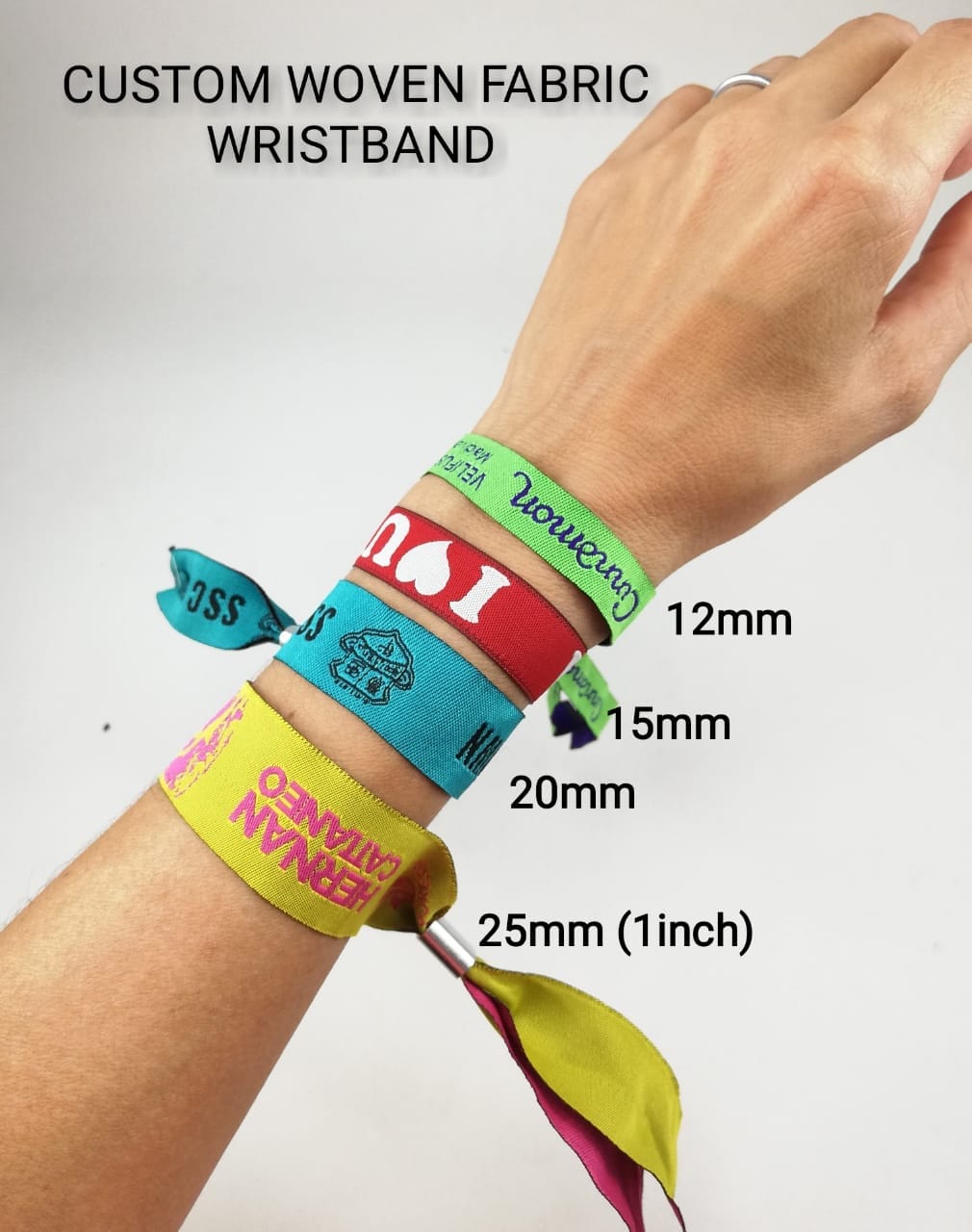 Customised Fabric wristbands with one-time use locks. Available in a range of widths and you can choose from two types of locks.